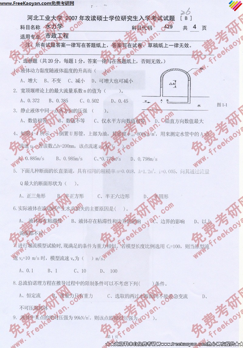 专业课半岛在线注册经验 本站小编 FreeKaoyan 2018-01-23河北工业大学2007年半岛在线注册真题-流体力学1