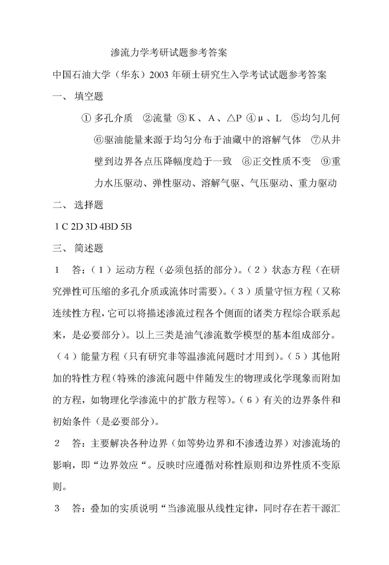 中国石油大学(华东)2003年半岛在线注册真题-渗流力学参考答案