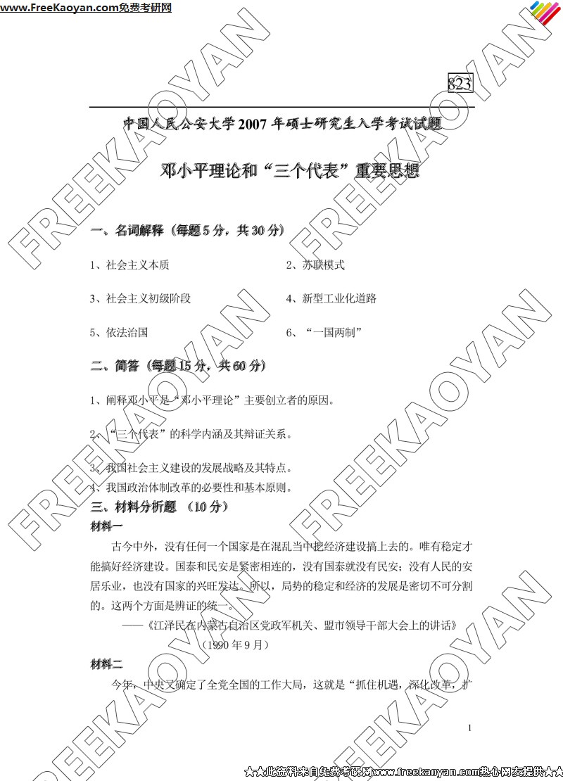 中国人民公安大学2007年半岛在线注册真题-邓小平理论与三个代表重要思想