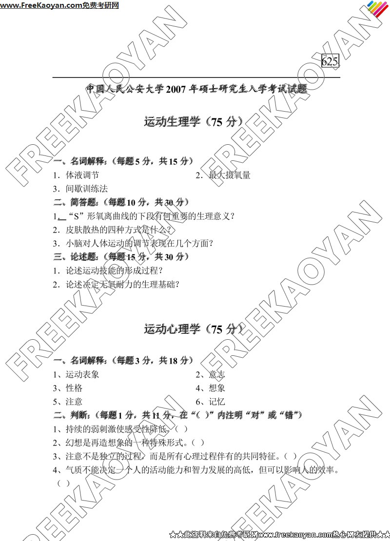 中国人民公安大学2007年半岛在线注册真题-运动生理学,运动心理学