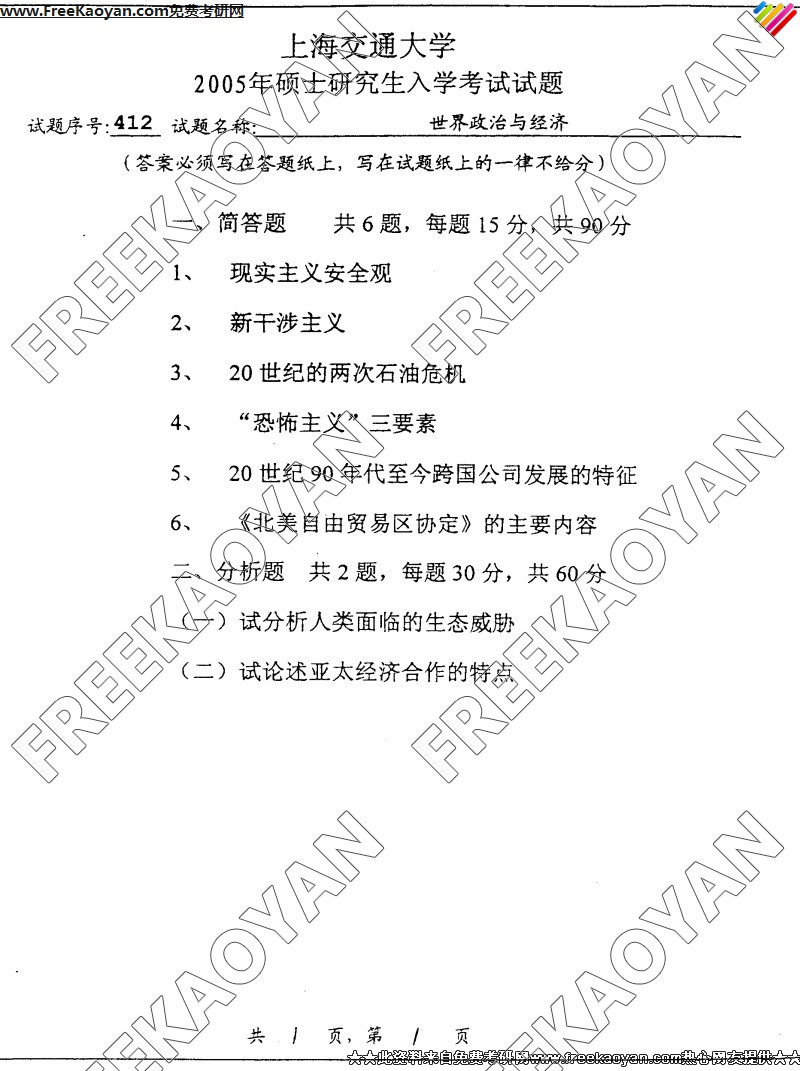 上海交通大学2005年半岛在线注册真题-世界政治与经济