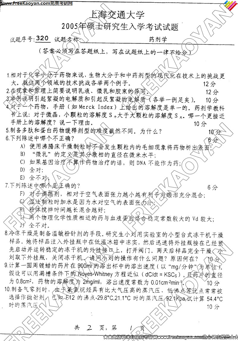 上海交通大学2005年半岛在线注册真题-药剂学