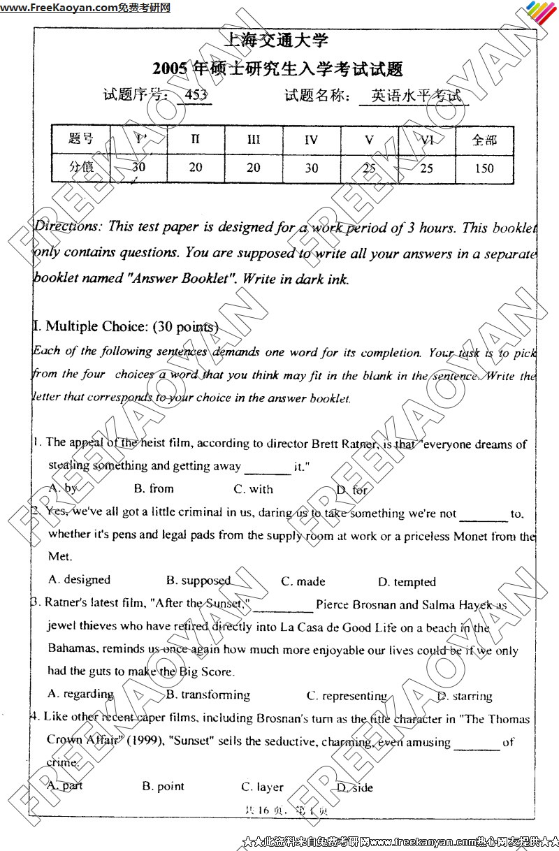 上海交通大学2005年半岛在线注册真题-英语水平考试