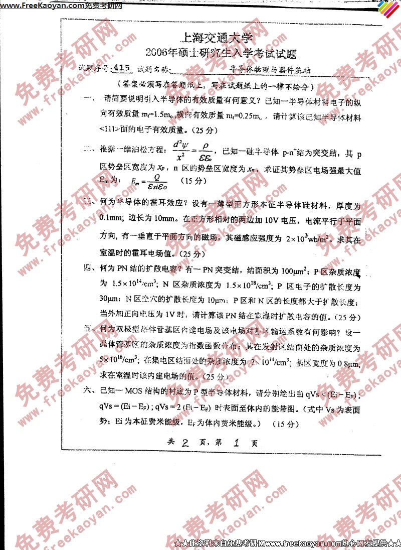 上海交通大学2006年半岛在线注册真题-半导体物理与器件基础