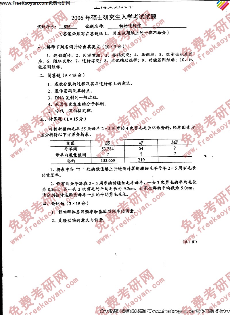上海交通大学2006年半岛在线注册真题-动物遗传学