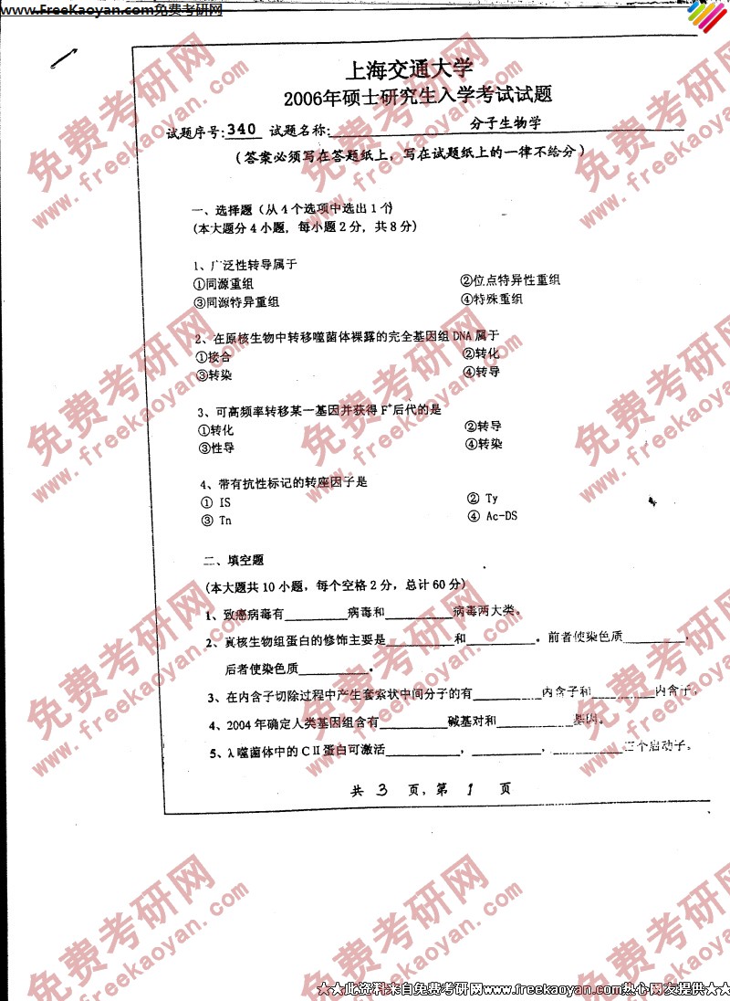 上海交通大学2006年半岛在线注册真题-分子生物学