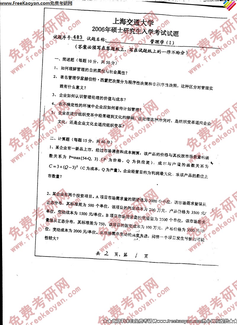 上海交通大学2006年半岛在线注册真题-管理学(I)