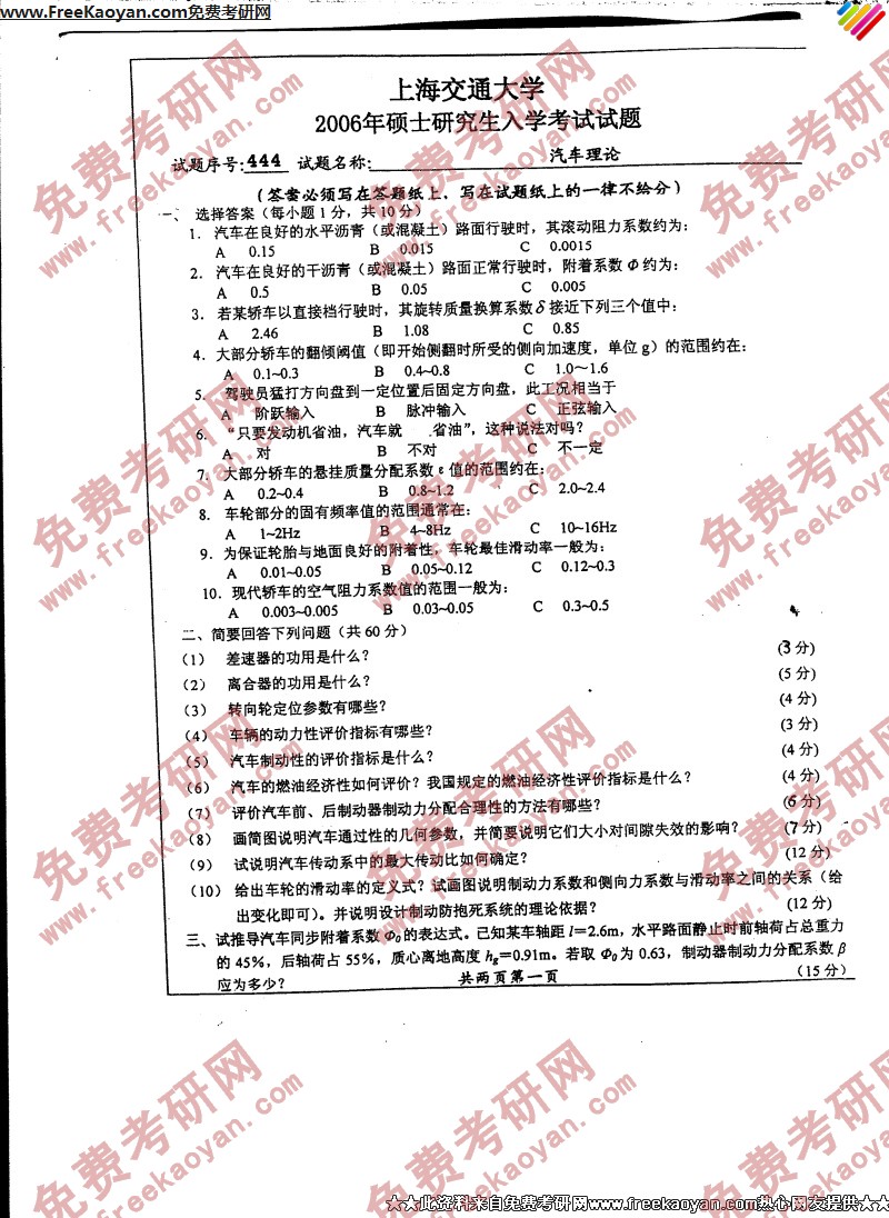 上海交通大学2006年半岛在线注册真题-汽车理论