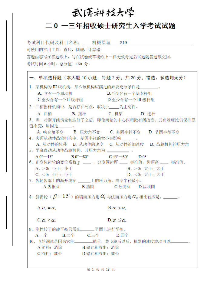 2013年武汉科技大学819机械原理B卷(2013年)半岛在线注册试题及答案