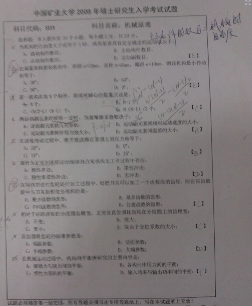 中国矿业大学2008年机械原理半岛在线注册真题带答案