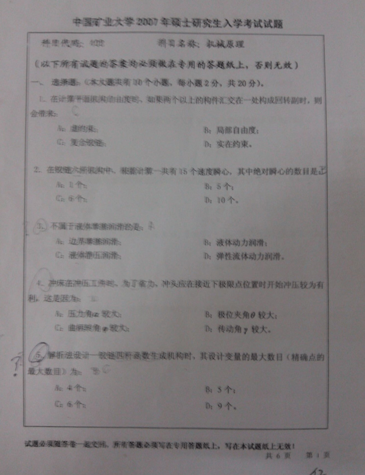 中国矿业大学2007年机械原理半岛在线注册真题带答案