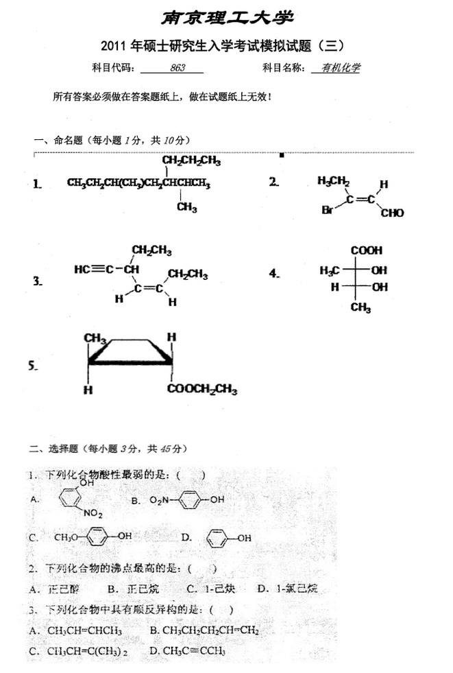 南京理工大学2011有机化学863半岛在线注册模拟题三及答案