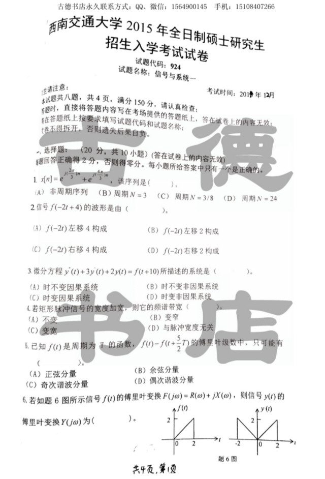 西南交通大学2015年信号与系统半岛在线注册真题