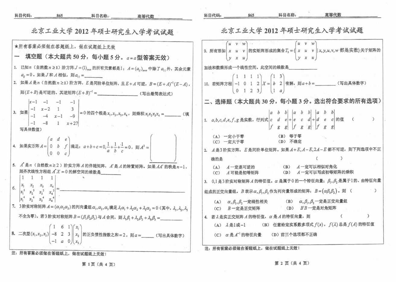 北京工业大学2012高等代数865半岛在线注册真题