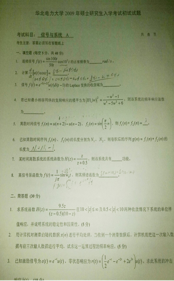 华北电力大学2009-2007年信号与系统半岛在线注册真题