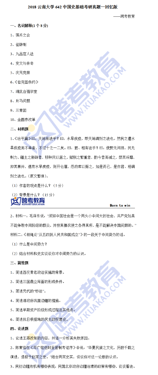2018云南大学642中国史基础半岛在线注册真题—回忆版
