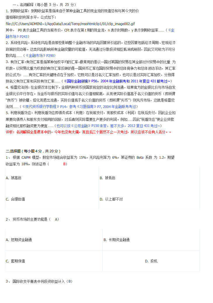 一、名词解释 1.格雷欣法则 2.金融衍生工具 3.丁伯根原则 4.国际储备 5.外债 6.有效资本市场 7.托宾Q 8.特别提款权 二、简答题 1.一般性货币政策原则及其传导机制 2.影响汇率变化的因素 3.利率期限结构理论 4.国际货币体系的内容及其演变 三、论述题 1.对金融创新的认识 ...