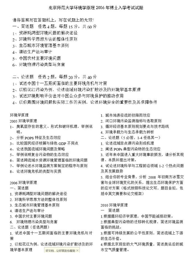 北京师范大学历年考博专业课真题(环境学原理-水环境学)