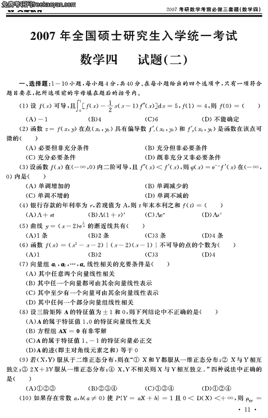2007半岛在线注册数学考前必做三套题(数学四试卷二)