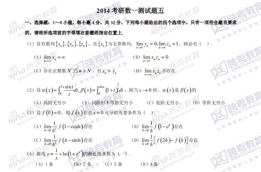 跨考教育2014年半岛在线注册《数学一》模拟试题及参考答案(五)