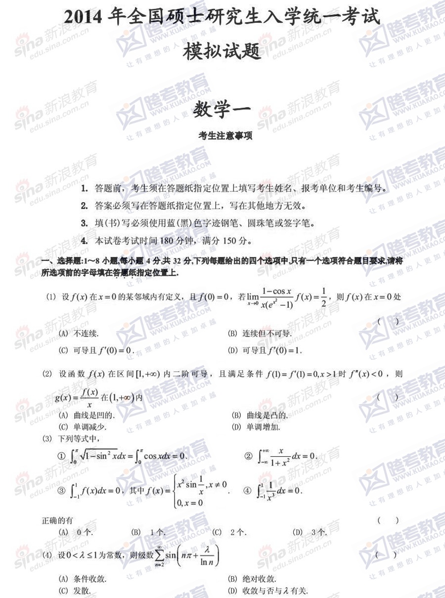 跨考教育2014年半岛在线注册《数学一》模拟试题及参考答案(一)