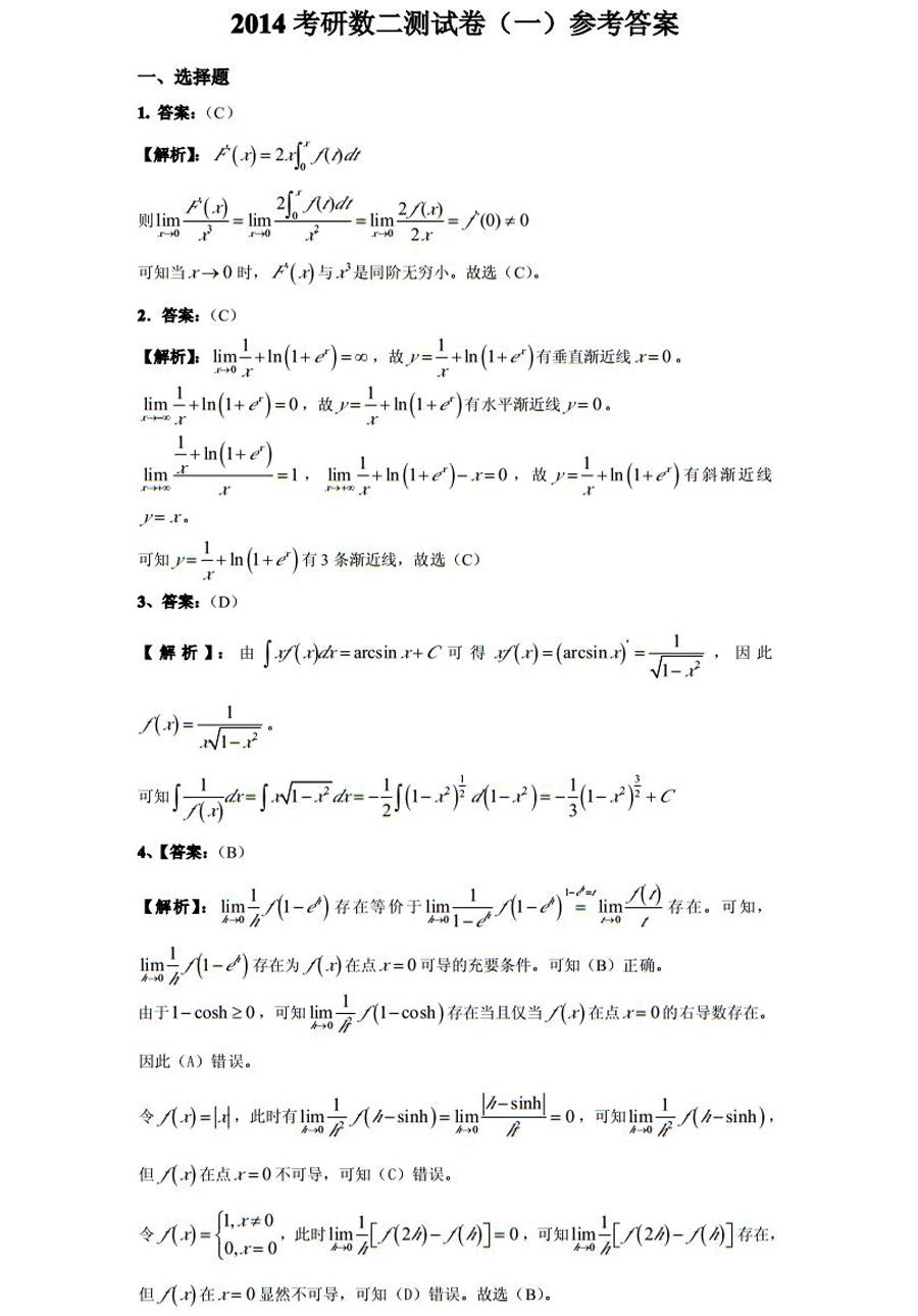 跨考教育2014年半岛在线注册《数学二》模拟试题及参考答案(一)