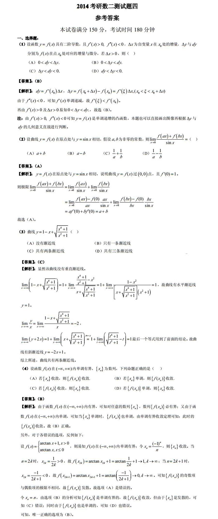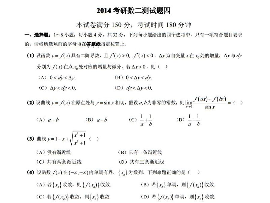 跨考教育2014年半岛在线注册《数学二》模拟试题及参考答案(四)