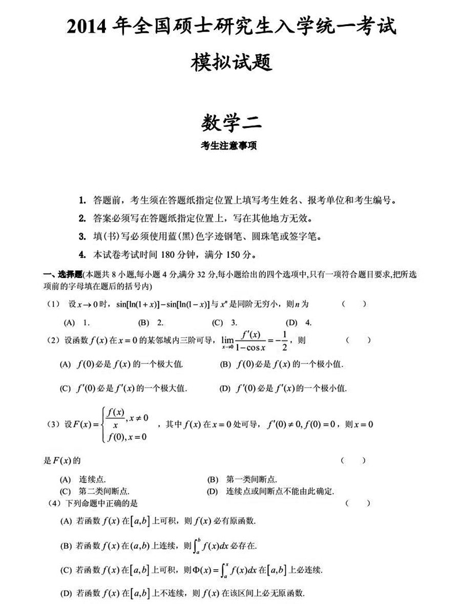 跨考教育2014年半岛在线注册《数学二》模拟试题及参考答案(二)