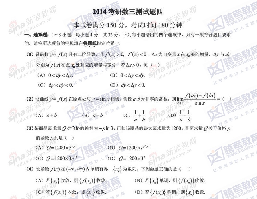 跨考教育2014年半岛在线注册《数学三》模拟试题及参考答案(四)