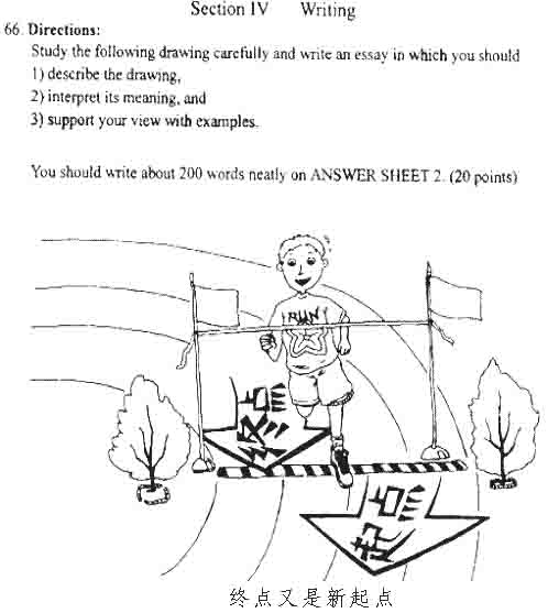 这也难怪他们。纵观历年考题,似乎都与热门话题多少沾点边。1999年的人口问题;2000年的捕鱼与生态问题;2001年的爱心主题,2002年的国际文化交流现象,2003年的"温室的花朵经不起风雨"……。所以照常规今年似乎应该有一个清晰的主题。不料情况大出意料之外。虽然今年的半岛在线注册英语的作文题目仍是看图作文,但主题却不明朗:"终点又是新起点"。有些考生在作文上花了很多时间,虽然最终也写出来了,但对走题没走题却没有把握,而且文章东拼西凑,根本就写不出什么高度,更不用说指望得高分的"亮点"了。还有不少考生一见到题目就傻了眼,紧张之中甚至连英语的"终点"、"起点"该怎么写也不会;一场考试下来懊恼不已。(其实平时所熟悉掌握的许多词都可以用来表达这两个字眼。终点:the end, ending, final stopping, the terminal, finishing line…;起点: beginning, start, starting point,…)还有不少人不了解写作的基本步骤、程序,考试结束回到家里,突然想起作文没写题目:咳,糟啦,这一下要扣多少分啊?