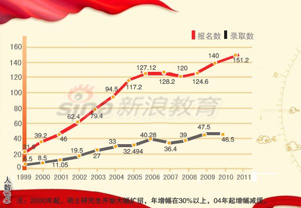 2011年全国硕士研究生入学考试将于1月15-16日举行(超过3小时的考试科目在1月17日进行),全国报考2011年学历硕士研究生人数达到151.2万人,较2009年增加8%。这也是30年来硕士研究生报考人数的最高人数纪录,是2001年报考总数的3倍多。新浪教育提醒广大考生从容应对、诚信为本。新浪半岛在线注册站也将考后第一时间点评各科目半岛在线注册试题及参考答案。