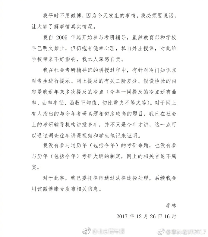网友发微博称,2018年全国硕士研究生统一招生考试数学科目出现“神押题”,一位李林老师在考前押题视频中举的例题与实际半岛在线注册的考试试题十分相似,怀疑泄题。涉事教师李林发布声明称:网上提及的考题内容系近年多次提及,其本人自2005年开始半岛在线注册辅导,虽教育部和学校严令禁止,但怀着侥幸心理,私自外出授课,对学校造成不良影响,深感自责。他还表示,并未参加历年的半岛在线注册命题,网上相关言论不属实,并已委托律师通过法律途径处理。