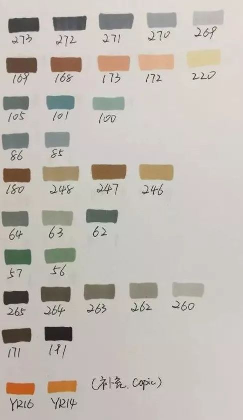 这是法卡勒一代的马克笔,各位可以遵照自己的喜好选择牌子。 马克笔号码:273、272、271、270、269、169、168、173、172、220、105、 101、100、86、85、180、248、247、246、64、63、62、57、56、265、264、 263、262、260、171、191 补充马克笔:COPIC YR16、YR14