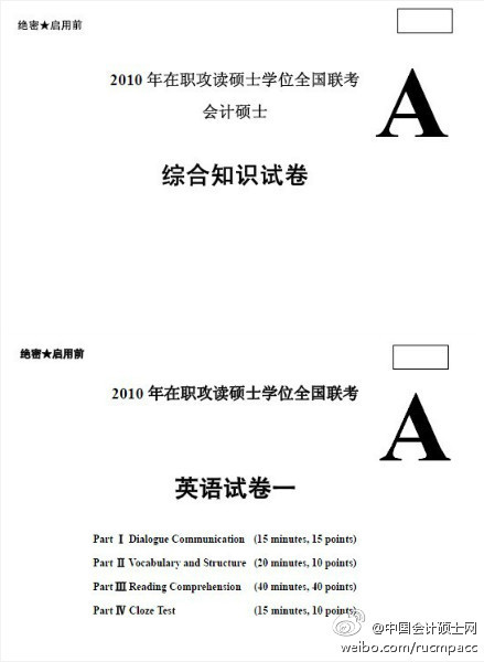 2010年10月在职人员攻读MPAcc英语考试大纲、样卷及其参考答案(2010/6/17) |